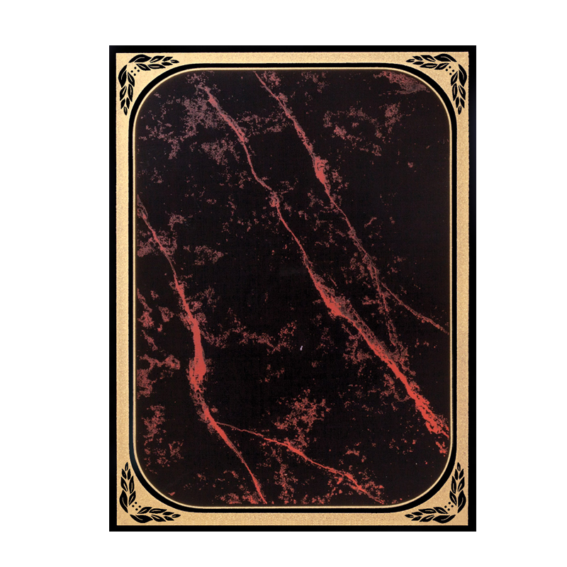 Item Description: 6 x 8 inch red marbleized brass plated steel with gold frosted border.
