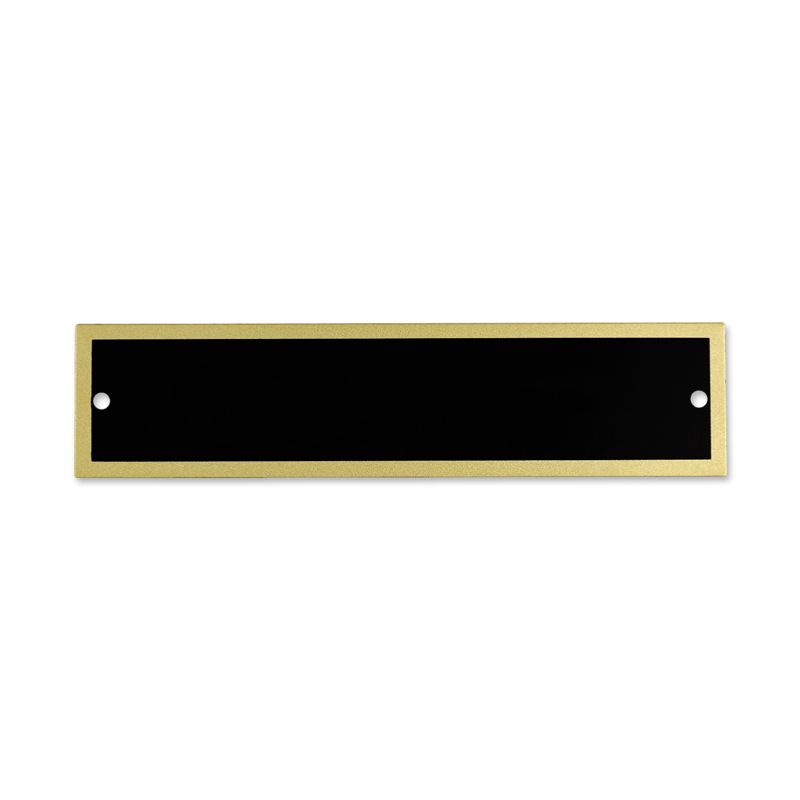 4-3/4 x 1-1/8 black and gold engraving plate. The plate features a gold border and two holes, one on each side. Black plate engraves gold. Engravable with up to 2 lines.