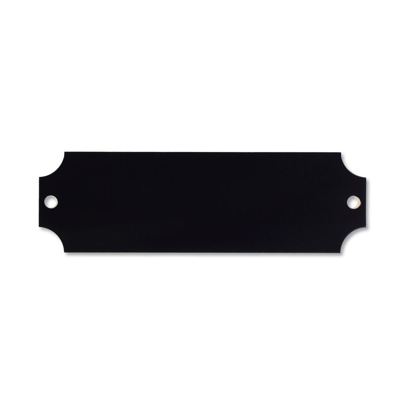 3-1/4 x 1 inch black brass perpetual engraving plate. The plate features notched corners and two holes, one on each side. Black plate engraves gold. Engravable with up to 3 lines.