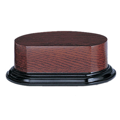 Item Description: 2-1/4 inch height walnut finish oval trophy base. 3-7/8 inch x 5-3/4 inch platform for figure. Center hole countersunk.