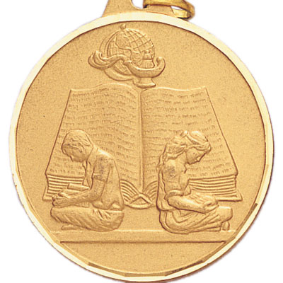This 2 inch die-struck medal is bordered with a method of scalloping that is identical in appearance to diamond cut engraving. It comes in multiple colors and can be engraved or imprinted only on the back face, due to the front face being adorned with a design illustrating a large open book with two people sitting and reading back-to-back in front of it. This medal is available in gold or bronze.