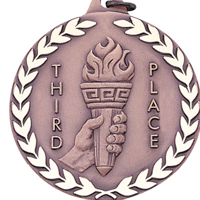 This 2 inch die-struck medal is engraved on its frontside with an image of a torch being held high with 'Third Place' written lateraly on either side of it, and a laurel wreath that encompasses the entire image. This medal comes available only in bronze and the back can be custom engraved or imprinted.